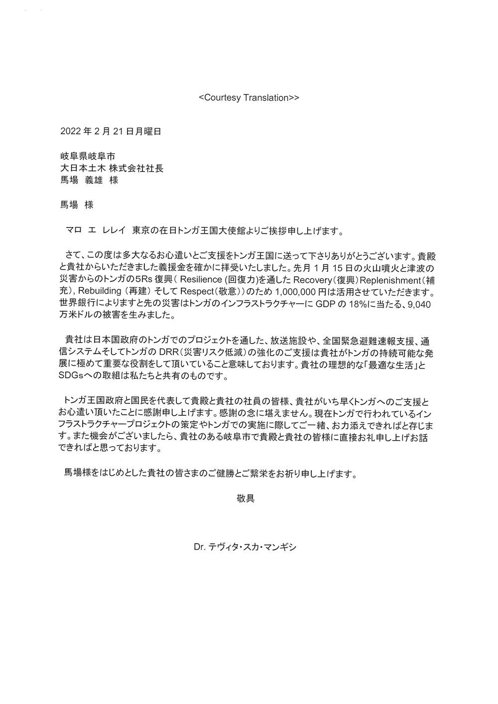 このたび2月10日(木)にトンガ王国海底火山噴火による被害に対する義援金を駐日トンガ大使館へ寄託しましたのでご報告致します。